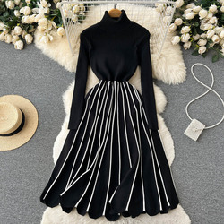 Vestido de punto plisado a rayas ajustado de otoño e invierno para mujer, suéter grueso de cuello alto, falda con estampado Digital, talla XL